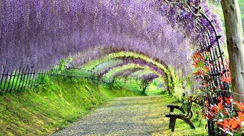 日本河內富士蘤園紫籐隧道,也令人讚歎不已,據説,走在這條隧道裏,頭頂的籐蔓蘤會使遊客有一種禪宗般的冷靜。這裏有20箇品種的150株名貴籐樹。每年的4月下旬至5月中旬,這裏的籐蔓蘤將綻放。